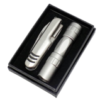 SET DE CORTAPLUMAS CON LINTERNASet de corta plumas con linterna. Navaja con sacacorchos, destornillador philips y plano, corta plumas, destapador, abre lata, tijera, 2 serruchos y cuchilla. Linterna: LED. Funciona con una pila AA. Productos relacionados S187 SET DE HERRAMIENTAS «COMPACT»Más información LINTERNA «AURA»Más información SET DE HERRAMIENTAS «ROYAL»Más información S506 HERRAMIENTERO «SCREW»Más información
